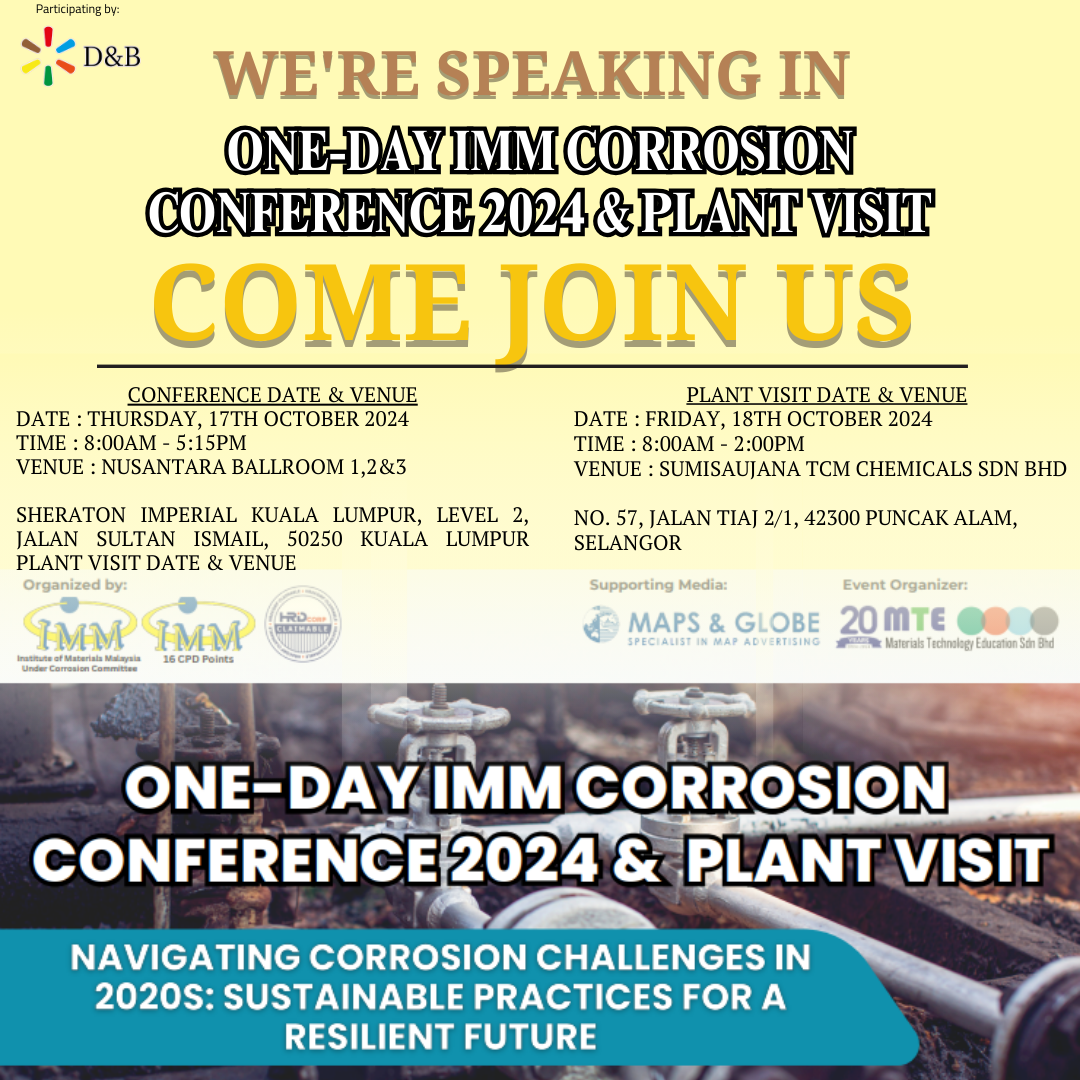 The One-Day IMM Corrosion Conference 2024 is your opportunity to learn from the industry finest like D&B Energy Sdn Bhd, on tackling corrosion challenges of the 2020s with sustainable solutions.